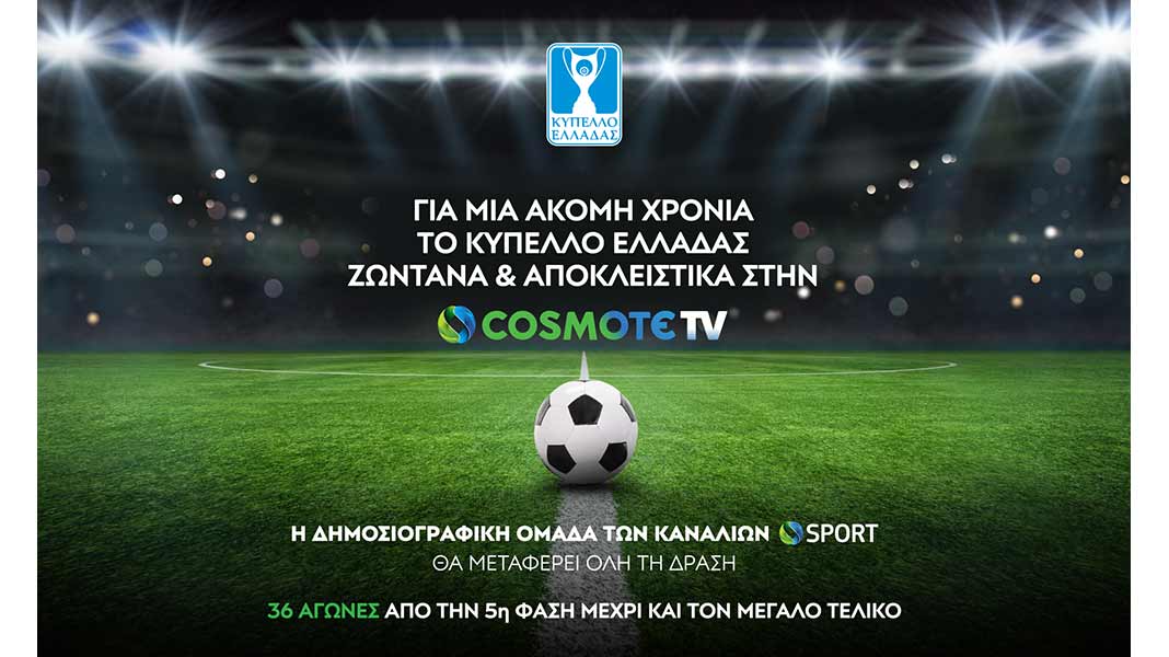 Για 13η χρονιά, το Κύπελλο Ελλάδας ποδοσφαίρου, ο θεσμός των μεγάλων εκπλήξεων, έρχεται ζωντανά και αποκλειστικά στην COSMOTE TV. Η δημοσιογραφική ομάδα των καναλιών COSMOTE SPORT θα μεταφέρει τη δράση 36 αγώνων, από την 5η φάση μέχρι και τον μεγάλο τελικό, με πλούσια ρεπορτάζ και ειδικές εκπομπές.