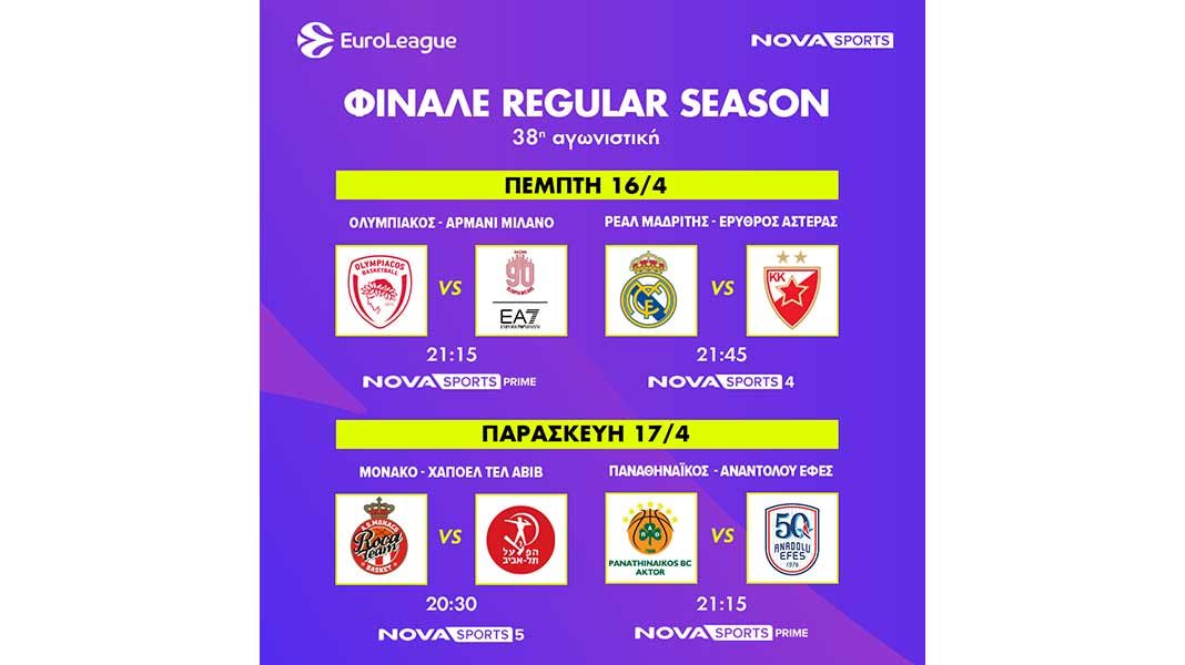 Μπασκετική πανδαισία με το φινάλε της κανονικής περιόδου της EuroLeague έρχεται στις οθόνες των συνδρομητών της Nova! Η κορυφαία ευρωπαϊκή διασυλλογική διοργάνωση στο χώρο το μπάσκετ ολοκληρώνει τη regular season όπου θα γίνει γνωστή και η τελική κατάταξη εν όψει των Play Offs και των Play In.