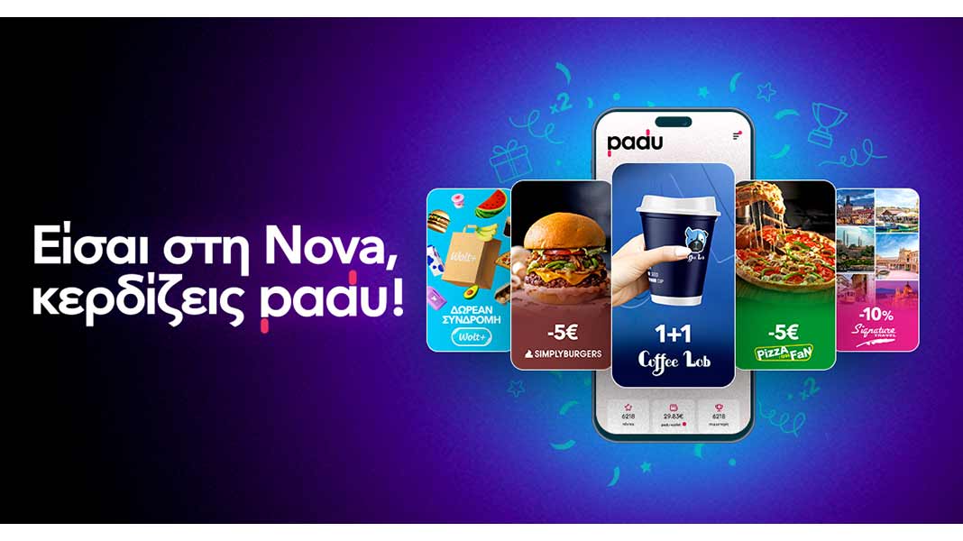 Η Nova, μέλος της United Group, του κορυφαίου παρόχου τηλεπικοινωνιών και media στη Νοτιοανατολική Ευρώπη, ενισχύει περαιτέρω το σχήμα επιβράβευσης των συνδρομητών της, σε συνεργασία με το padu, την καινοτόμα ελληνική εφαρμογή.