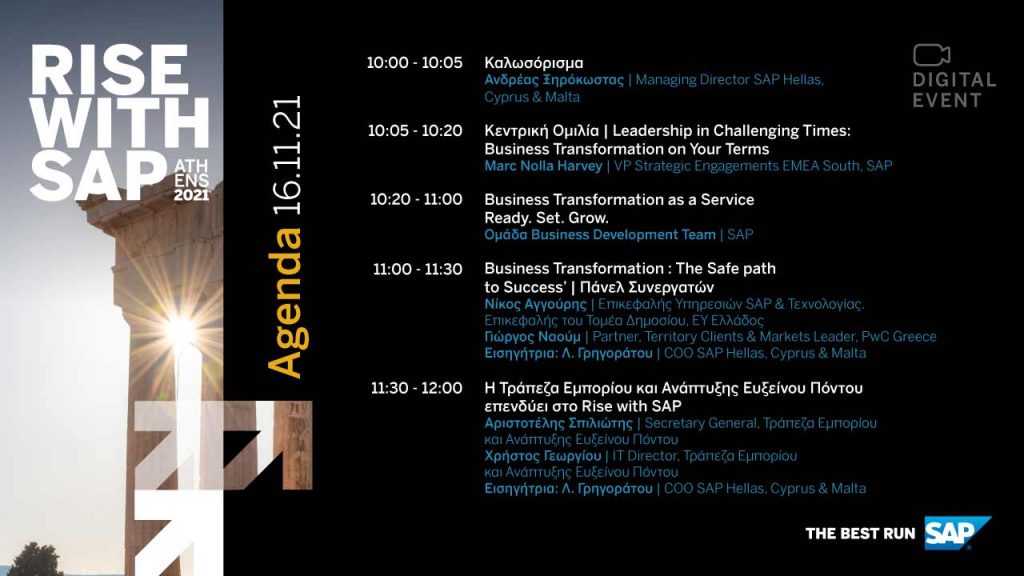 Το “Rise With SAP, Athens 2021” έρχεται δυναμικά αύριο, Τρίτη 16 Νοεμβρίου στις 10:00 π.μ., σε ζωντανή μετάδοση για να συστήσει όλα τα οφέλη της πρότασης «Rise with SAP», μέσα από μία σειρά εισηγήσεων από εκλεκτούς καλεσμένους που θα «φωτίσουν» όλες τις διαστάσεις του επιχειρησιακού μετασχηματισμού ενός οργανισμού.