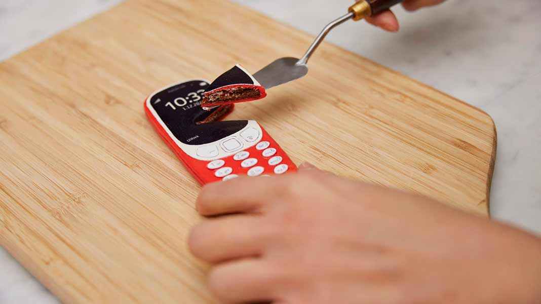 Ένα σούπερ-ρεαλιστικό κέικ του πολυαγαπημένου και θρυλικού Nokia 3310 σε κόκκινο χρώμα παρουσιάστηκε για τον εορτασμό των πέντε χρόνων της HMD, αντιπροσώπου των κινητών Nokia.