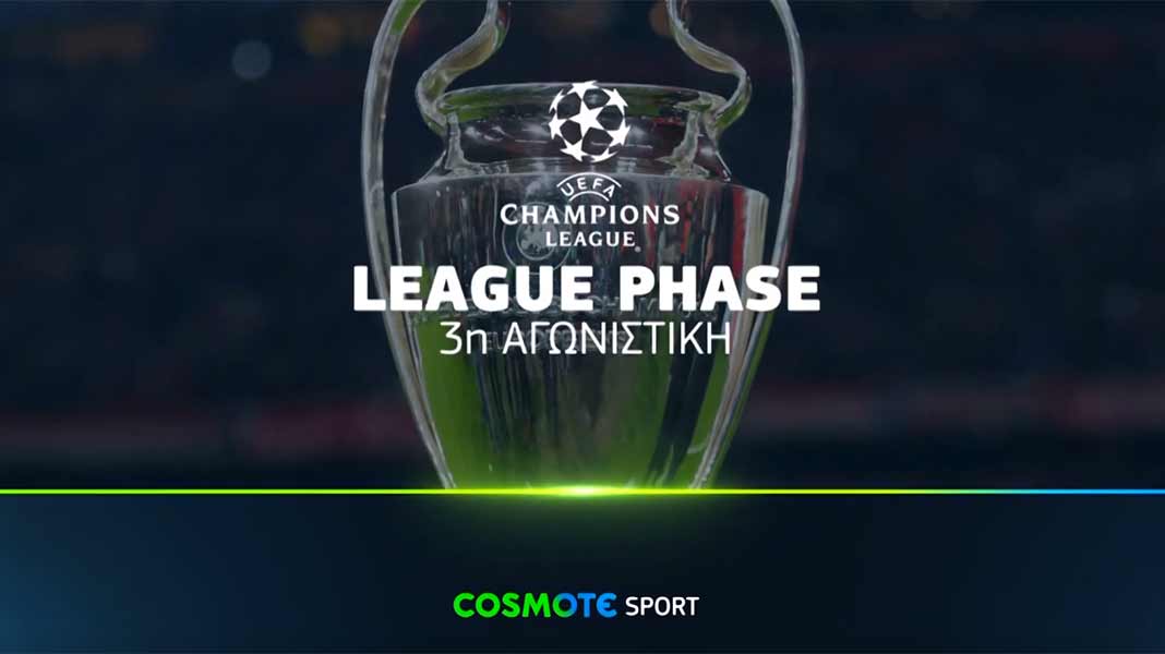 Η 3η αγωνιστική της League Phase του UEFA Champions League έρχεται το διήμερο 21-22/10 στην COSMOTE TV. Ο Ολυμπιακός θα ταξιδέψει στη Βαρκελώνη για να βρεθεί αντιμέτωπος με την πρωταθλήτρια Ισπανίας, Μπαρτσελόνα (21/10, 19.45, COSMOTE SPORT 2HD & 4K). Από το πρόγραμμα το διημέρου ξεχωρίζει, επίσης, η «μάχη» ανάμεσα στην Άρσεναλ του Μικέλ Αρτέτα και στην Ατλέτικο Μαδρίτης του Ντιέγκο Σιμεόνε (21/10, 22.00, COSMOTE SPORT 4HD & START), καθώς και η «επανάληψη» του τελικού του 2017 μεταξύ Ρεάλ Μαδρίτης και Γιουβέντους (22/10, 22.00, COSMOTE SPORT 2HD & 4Κ). Τον παλμό της ποδοσφαιρικής δράσης θα μεταφέρει η δημοσιογραφική ομάδα των καναλιών COSMOTE SPORT, μέσα από πλούσια ρεπορτάζ και ειδικές εκπομπές.