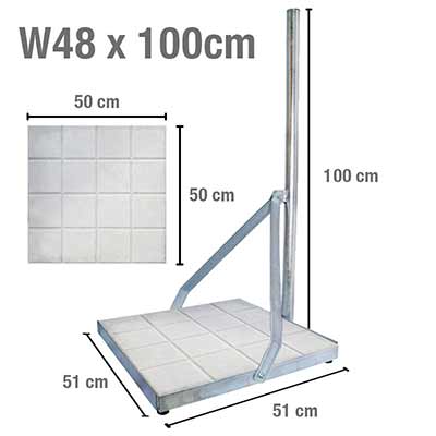 Για όλες τις παραπάνω περιπτώσεις και όχι μόνο, υπάρχει η συγκεκριμένη βάση που σας παρουσιάζουμε. Πρόκειται για μία μεταφερόμενη επιδαπέδια κάθετη βάση με 2 βραχίονες σταθερότητας και μεταλλικό πλαίσιο βάσης/υποδοχή για τοποθέτηση βάρους (τύπου πλάκας πεζοδρομίου), για την στήριξη ιστού, κατόπτρου, κεραίας κλπ..