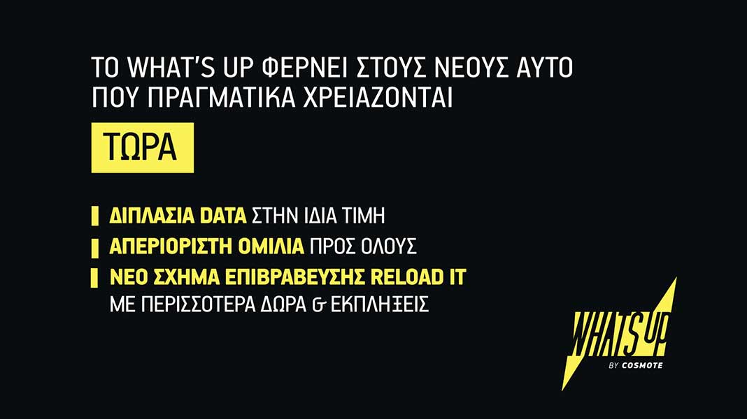 Διπλάσια data στην ίδια τιμή σε όλα τα πακέτα #GIGA και νέο πακέτο με απεριόριστη ομιλία προς όλους προσφέρει το WHAT’S UP της COSMOTE, αποδεικνύοντας στην πράξη πως είναι εδώ για τις ανάγκες των νέων.Παράλληλα, το WHAT’S UP παρουσιάζει το νέο Reload It, το ανταποδοτικό σχήμα, που προσφέρει σε όλους τους συνδρομητές ακόμα περισσότερα δώρα και εκπλήξεις σε κάθε ανανέωση.